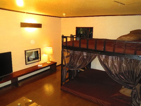 ファミリールームの広いスペースやんばるの森をイメージしました4名様から6名様まで対応のファミリールームカップルや女の子同士に人気のお部屋緑の窓から見上げた空大人気のロフトタイプ優しい日差しに包まれますジャングルの小鳥お友達同士に好評